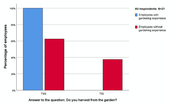 Both the survey and the site visits indicate that gardening experience influences whether staff harvest vegetables and herbs and whether they incorporate them into their cooking practices. The survey shows that employees with gardening experience are more likely to harvest vegetables and herbs from the garden than employees without gardening experience (Figure 5). A Fisher’s Exact test shows that this relationship between gardening experience and harvesting is significant: if employees have gardening experience, they are more likely to harvest from the indoor garden, p = 0.042.
