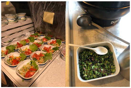 Distribution of relationship between gardening experience and interest in harvesting from the gardens. The vegetables and herbs are processed in the kitchen or served with the meal immediately after harvesting. Crops such as lettuce are mainly used to make a side dish such as a salad and the sprouting vegetables are usually served raw with the meal (Figure 6). Herbs are served mainly as a flavour enhancer in the soup. We found that the extent to which employees use the garden produce in the cooking practices not only depends on their gardening experience, but also on their cooking competences. These competences are different in the four nursing homes. In Oosterwolde and Lorentzhuis, a professional chef is present. These chefs are trained to prepare meals in nursing homes, and they are in charge of the kitchens: they have ample knowledge and experience in cooking. Chefs in Oosterwolde and Lorentzhuis do not need much advice or motivation from the food expert to use fresh vegetables and herbs from the gardens in the meals. They harvest the crops and know how to use them. Biesdel and ′t Jagthuis do not employ professional chefs, but the food expert explained that the employees at Biesdel are more experienced in cooking (and therefore harvest more often) than those in ′t Jagthuis. Some employees have been working at Biesdel for more than thirty years, and have experienced many changes in care, including food preparation. As a result, Biesdel employees have a lot of cooking experience. When younger employees have to prepare the food, they are almost always accompanied by an older employee, resulting in an exchange of knowledge regarding cooking. Working together can encourage better integration of the vegetables and herbs in the meals, because employees can share ideas and experiences. Moreover, in Biesdel, the same employees are often in charge of cooking. These employees, therefore, gain cooking experience and competences.