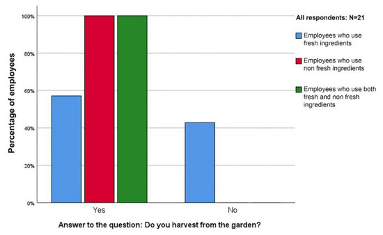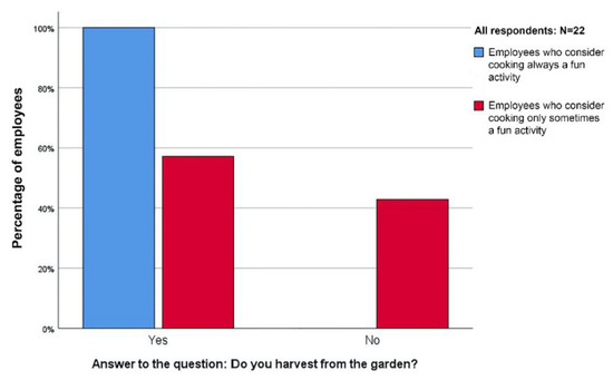 Besides the availability of harvesting and cooking competences, whether or not employees enjoy cooking also matters for whether they use the indoor garden in their cooking practices. Fifteen out of the 22 employees consider cooking a fun activity. When employees enjoy cooking, they show more interest in harvesting from indoor gardens and subsequently changing their cooking practice. A Fisher’s Exact Test confirms that there is a significant relationship between enjoying cooking and harvesting, p = 0.023. In other words, employees who see cooking as a fun activity are more likely to harvest from the garden (Figure 7).