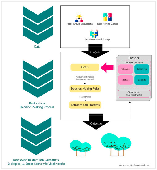 Findings on the contextual reasons and the nature of the goal frames central to undertaking restoration practices and activities can offer insights for policy and programming on entry points to boost restoration efforts from a demand-side management perspective. Further, farmers’ restoration decision-making rules constitute an important input for representing agents’ decisions in computational agent-based models (ABMs) that explore outcomes of restoration investments by simulating such social processes. The identified decision-making rules linked to the corresponding social actors’ actions (specific restoration activities and practices) provide the overall decision-making processes to encode into a land-use/cover and change (LUCC)-ABM. These rules can substitute the often ad hoc representation of human decisions in LUCC-ABMs. Crooks et al. [10] previously stressed such challenges and Groeneveld et al. [11] discovered that out of 134 LUCC-ABMs reviewed worldwide, 83 did not ground the representation of the socio-behavioral processes in theory or in empirical observations. Earlier reviews of ABM applications have also pointed to such challenges [12]. In this paper, we offer a conceptual approach, with methodological application, to decompose empirical data to inform such representation.