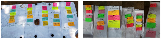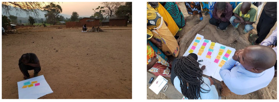 During the discussions, we used open-ended questions to gain insights into the general context for the development of the rules for both individual and collective restoration activities. Specifically, we sought farmers’ perceptions of environmental restoration, the (frequency of the) restoration practices and activities they use, and the reasons underlying the restoration behaviors. Since these narratives are more reflective than actionable, we also introduced games [37,38] where the participants were actively engaged in realistic restoration action-situations to express their behaviors. Through games, we could observe and gain insights on the “whys” and the “hows” behind farmers’ decisions to embark on individual and collective restoration activities under real-world circumstances. After listing their factors on colored cards, farmers ordered them by level of importance on flip charts. Sub-groups of 5–6 farmers then simulated their rules using the colored cards for ten minutes, separate from the others. The simulated rules were then subjected to plenary discussions where all the participants commented and discussed similarities or differences (Figure 3). Finally, farmers were asked if they would change the rules in case of extreme weather events such as floods and droughts, or when government policies (affecting environmental degradation) change.