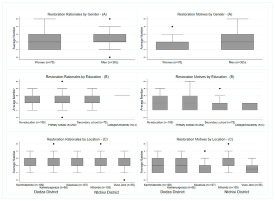Differences in the average number of restoration rationales and motives by gender, education, and location among farmers engaged in restoration (N = 443). Note: Each box-and-whisker diagram depicts the quartile-based distribution of the number of rationales/motives per group/factor of comparison. The boxes indicate the interquartile range; the lines (whiskers) show the minimum and maximum range outside the quartiles; and the dots are extreme values (outliers).