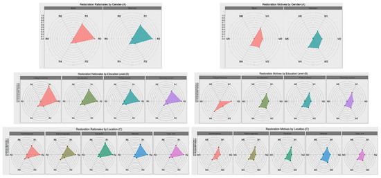 Types of restoration rationales and motives by gender, education, and location. Notes: Radar charts comparing the mean value (on a scale of 0–1) of each type of rationale/motive among the different groups/factors. Rationales: R1 = Severe land erosion and gully formation; R2 = Low soil fertility/low crop yield; R3 = Awareness of biodiversity loss; R4 = Difficult provision of biomass energy (scarce firewood and tree scarcity limits charcoal making); R5 = Water resource scarcity (siltation of rivers and scarce water from catchment); R6 = Other restoration rationales. Motives: M1 = Project-based motivations (NGOs incentives and government-promoted programs); M2 = Influences from peers/friends and the media; M3 = Leadership, encouragement, and support of local authority; M4 = Altruistic behaviors and environmental civism (bequest/altruist behavior and civic morality/community loyalty); M5 = Other restoration motives; M6 = Rationales elements (soil erosion/land degradation, low yield, deforestation, and rainfall scarcity).