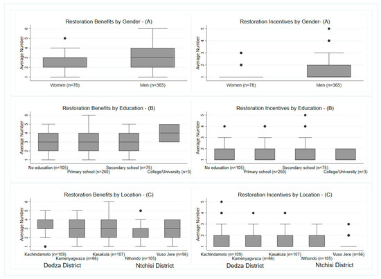 Differences in the average number of restoration benefits and incentives by gender, education, and location among farmers engaged in restoration (N = 443). Note: Each box-and-whisker diagram depicts the quartile-based distribution of the number of benefits/incentives per group/factor of comparison. The boxes indicate the interquartile range; the lines (whiskers) show the minimum and maximum range outside the quartiles; and the dots are extreme values (outliers).