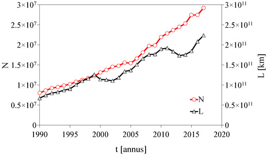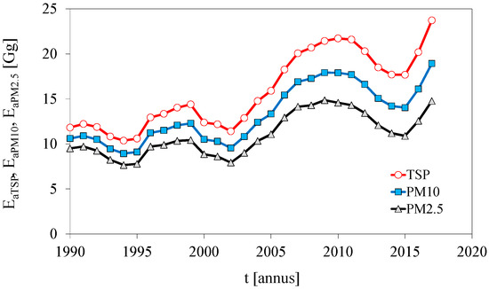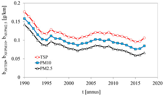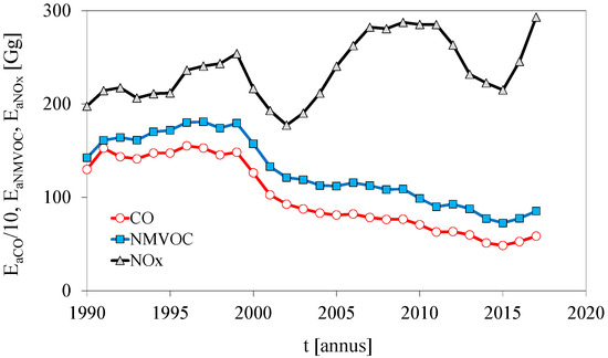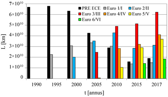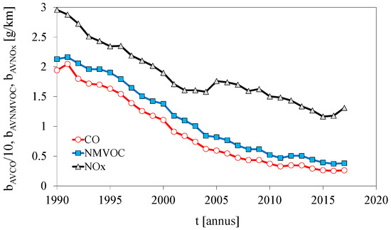 - Between 1990 and 2017, the average specific distance emission arising from road vehicles has decreased considerably. This clear improvement in the intensive characteristic of pollutant emission results from significant upgrading of the vehicle technology level in terms of reducing emission. In addition, it is known that the intensity of use of vehicles of higher ecological categories is much greater than of vehicles of lower ecological categories [18], which is confirmed by the data for inventory of pollutant emission from road transport in Poland, documented in the report [15].