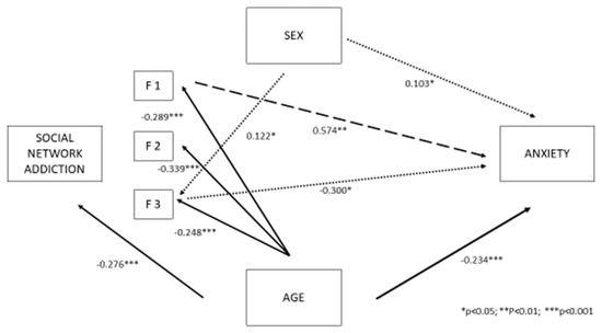 The relationships among the different study variables were subsequently studied see Table 5. There was a significant positive correlation between addiction to social networks and anxiety (r = 0.232, p < 0.001) and between each of the factors that make up addiction and anxiety (F1: r = 0.237, p < 0.001; F2: r = 0.230, p < 0.001; F3: r = 0.201, p < 0.001); in all cases, it was a low–moderate correlation (Cohen, 2013). On the other hand, there was a significant and moderate negative relationship [25] between age and addiction to social networks (r = −0.318, p < 0.001). This indicates that, the older the age, the lower the addiction score was (as shown in Table 4). The gender variable was not correlated with total addiction to social networks except for Factor 3 (excessive use), for which there was a low–positive significant relationship (F3: r = 0.118, p = 0.025).