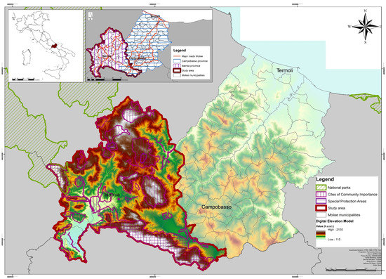 The study area (about 1819 km2), usually named “High Molise”, belongs to the Molise Regions and includes two provinces and 61 municipalities. The area is mainly hilly/mountainous locations (respectively 36% and 34% of the total study area) of limestone origin (Figure 1). The mountains exceed 1500 meters in height (up to 2155 m above sea level and the flat parts are concentrated mainly in the valleys of the Trigno and Sangro rivers. The area is characterized by the presence of Turkey oak and white fir. Over 1100 meters, beech trees and grasslands characterized by a wide variety of flora, are present. Great biodiversity is reported also for the fauna characterized by the presence of the Marsicano brown bear, wolves, otters and many species of birds of prey, including the golden eagle. Study area presents a high natural, environmental and cultural-historic value, highlighted by one national natural national park (Abruzzo Lazio Molise National Park), the proposal perimeter of a new-building national park (Matese National Park), 35 Sites of Community Interest(SCIs) and 7 Special Protection Areas (SPAs), urban historic centers and natural trails for the herds passage “tratturi”
