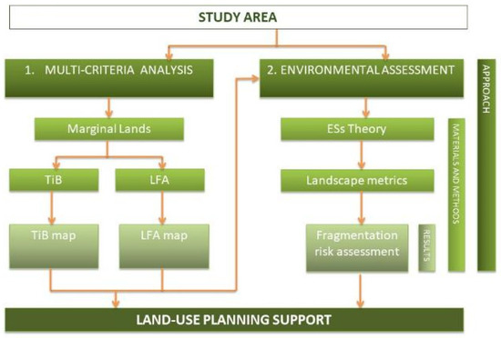 Specifically, this study entails two steps. Firstly, potential marginal areas identification has been carried out, starting from Less Favored areas (LFAs) perimeters and the Territories in Between (TiBs) definition, integrating socio-economic disadvantage with development suitability. Secondly, starting from the identification of the marginal lands, ESs assessment, by means of a landscape metrics approach, has been performed (Figure 2).