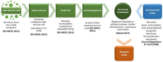The areas sorted out were compared and integrated with the Territories in Between (TiBs), based on EU documents and scientific research devoted to landscape and urban planning studies [2,22,23,66], according to the following steps: