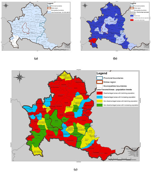 - Mipaaf, Ministry of Agricultural, Food and Forestry policies. Atlante Nazionale del territorio rurale. In Monografie Regionali Sulla Geografia Delle Aree Svantaggiate; Regione MOLISE, Caire Urbanistica; Available online: https://www.reterurale.it/atlante/molise/pdf/pdf_monografia/s_monografia_molise.pdf (accessed on 1 May 2020).