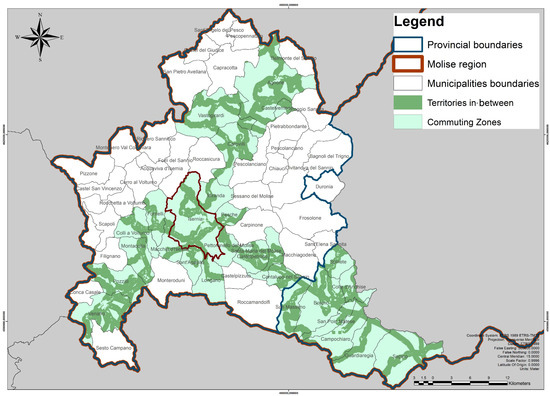The defined commuting zones (Figure 5) cover 851 km2, entail 31 municipalities (with 94,576 inhabitants) and include the main local industrial centers of Venafro-Pozzillo (IS) and Bojano (CB).