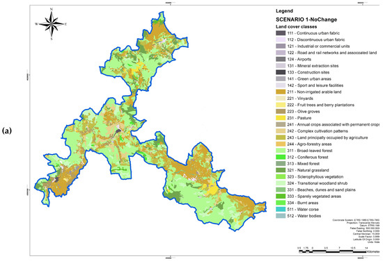 - Scenario 1—No changes scenario: the current land uses and land covers is supposed to last for years. This scenario is based on the CLC 2018 classification, integrated with the Molise Land Use Map 2010;