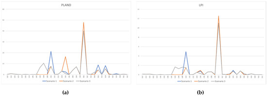 The Largest patch index (LPI) and Percentage of landscape (PLAND) belong to the “Area and Edge Metrics” metrics group that deals with the size of patches and the amount of edge created by these patches, which are useful in landscape fragmentation analysis. Although there are myriad effects of habitat fragmentation on habitat use patterns, and intra- and inter-specific interactions, many of these effects are caused by a reduction in habitat area and continuity, and an increase in the proportion of edge-influenced habitats [62].