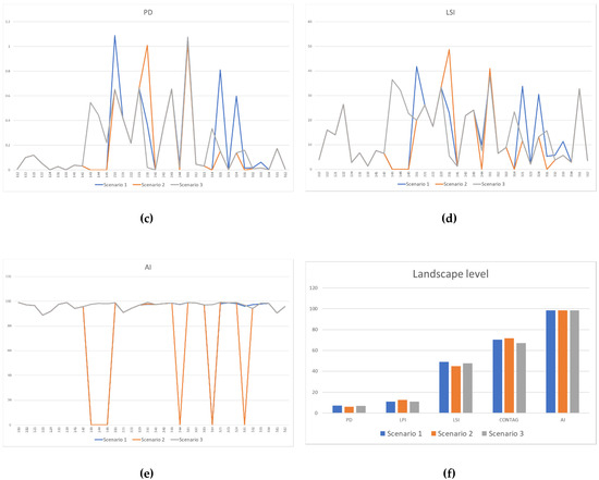 The present study focused on some LMs which deepen the fragmentation aspect of landscapes because of the importance of fragmentation issue in spatial planning policies [80] and because it is deeply connected with the land-use scenarios comparison. In Europe, landscape fragmentation has been a fairly widespread process since the end of the 19th century in intensively used regions. Fragmentation could be considered as the product of the linkage of built-up areas via linear infrastructure, such as roads and railroads [81,82]. It consists of the transformation of larger patches of habitat in smaller ones, or fragments, which tend to be more isolated than in original conditions [83]. Habitat fragmentation analysis by means of landscape metrics allows for observing a process in which contiguous habitats are progressively sub-divided into smaller, geometrically more complex areas [84].