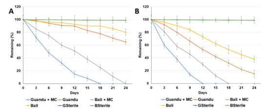 The aerobic degradation of the ACE in the Guandu and Bali sediments are shown in Figure 1. We first found that the remaining percentage of ACE observed after 24 d in the Guandu and Bali non-ACE-adapted sediments without the addition of MC was 65.1% ± 4.1% and 80.8% ± 3.4%, respectively. The remaining ACE in the Guandu and Bali ACE-adapted sediments without added MC was 15.4% ± 3.7% and 38.4% ± 4.1%, respectively. The remaining ACE after 24 d in the Guandu and Bali ACE-adapted sediments without added MC was 15.4% ± 3.7% and 38.4% ± 4.1%, respectively. For the Guandu and Bali ACE-adapted sediment supplemented with MC, ACE was completely degraded after 12 and 18 d, respectively.