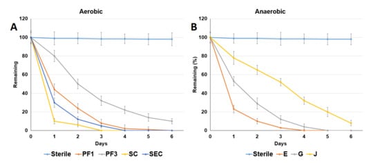 Bacillus pumilus has been previously shown to degrade total petroleum hydrocarbons in contaminated soil [], while Bacillus aerius has been isolated, characterized and identified as a potential diuron-degrading bacterium []. Bacillus aryabhattai was previously isolated from pulp and paper mill wastewater and characterized as having lignin-degrading potential []. Arthrobacter ginkgonis was a Gram-positive, aerobic strain which displayed a rod–coccus growth lifecycle, was isolated from the rhizosphere of Ginkgo biloba L []. Enterobacter hormechei has been isolated from activated sludge and shown to transform diclofenac [] as well as to bioconvert lutein into a new compound, 8-methyl-alpha-ionone []. Clostridium sphenoides is able to metabolize citrate as a sole carbon source, and a Clostridium sp. was previously shown to be capable of fermenting glucose, but not citric acid []. Lysinibacillus fusiformis has been shown to decolorize a selected azo dye []. These reports showed that Bacillus pumilus, Bacillus aerius, Bacillus aryabhattai, Enterobacter hormechei, Clostridium sphenoides and Lysinibacillus sp. had the degradation ability. However, there is no information about the degradation properties of Arthrobacter ginkgo.