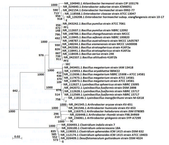 A phylogenetic analysis of the 16S rRNA gene sequences of the isolated bacterial strains is shown in Figure 3. The aerobic strains PF1, PF3, SC and SEC were observed to be closely associated with Bacillus pumilus, Bacillus aerius, Arthrobacter ginkgonis and Bacillus aryabhattai, with similarities of 99%, 100%, 99% and 100%, respectively. In addition, the anaerobic strains E, G and J were observed be closely related to Enterobacter hormechei, Clostridium sphenoides and Lysinibacillus sp., with similarities of 99%, 99% and 99%, respectively (Table 2).