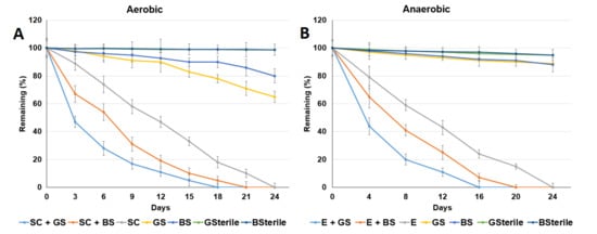 Physicochemical methods such as primarily advanced oxidation processes (AOPs), homogeneous and heterogeneous photocatalysis, Fenton and Fenton like reactions, ozonation, and methods involving ultrasound and microwave treatments, or electrochemical processes are not appropriate for treating ACE in mangrove sediments []. Biodegradation is an effective strategy to remove organic pollutants from sediments. Most studies on pharmaceutical biodegradation are focused on their removal during wastewater treatment processes []. Some investigations evaluated the microbial degradation of drugs and artificial compounds in freshwater [] as well as in ocean and estuary waters []. The microbial degradation of drugs depends on the prevailing oxygen availability and redox conditions in sediments. However, little is known regarding the aerobic and anaerobic biodegradation potential of ACE in mangrove sediments.