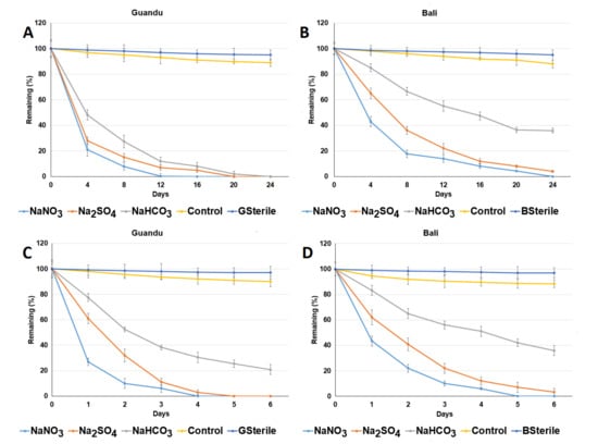 As shown in Figure 5A, ACE was completely degraded after 12, 20 and 24 d in the Guandu non-ACE-adapted sediment supplemented with NaNO3, Na2SO4 and NaHCO3, respectively. For the Bali ACE-adapted sediments supplemented with NaNO3, Na2SO4 or NaHCO3, the remaining amount of ACE detected after 24 d was ND (non-detected), 4.1% ± 0.6% and 35.9% ± 1.8%, respectively (Figure 5B). The ACE anaerobic degradation data in Figure 5 were fitted to first-order kinetics. For the Guandu ACE-adapted sediments supplemented with NaNO3, Na2SO4 or NaHCO3, the observed ACE degradation half-lives were 1.16 ± 0.06, 2.39 ± 0.12 and 2.79 ± 0.14 d, respectively. For the Bali non-ACE-adapted sediments supplemented with NaNO3, Na2SO4 or NaHCO3, the observed ACE half-lives were 3.05 ± 0.15, 3.84 ± 0.19 and 10.75 ± 0.53 d, respectively. In contrast, for the Guandu non-ACE-adapted sediments supplemented with NaNO3, Na2SO4 or NaHCO3, the remaining amount of ACE detected after 6 d was ND, ND and 20.8% ± 1.1%, respectively (Figure 5C). For the Bali ACE-adapted sediments supplemented with NaNO3, Na2SO4 or NaHCO3, the remaining amount of ACE detected after 6 d was ND, 3.3% ± 0.6% and 35.9% ± 1.8%, respectively (Figure 5D). For the Guandu non-ACE-adapted sediments supplemented with NaNO3, Na2SO4 or NaHCO3, the observed ACE half-lives were 0.48 ± 0.02, 0.64 ± 0.3 and 1.79 ± 0.09 d, respectively. For the Bali ACE-adapted sediments supplemented with NaNO3, Na2SO4 or NaHCO3, the observed ACE half-lives were 0.55 ± 0.03, 0.93 ± 0.05 and 2.85 ± 0.14 d, respectively.