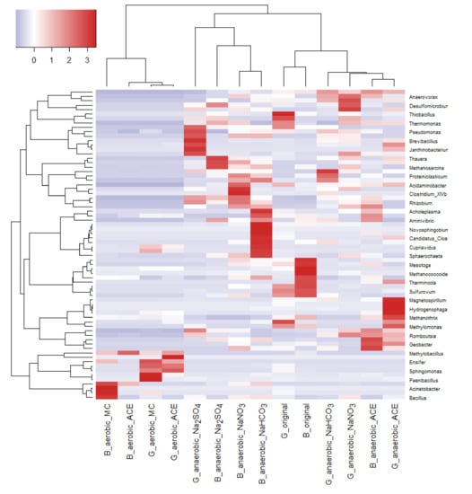 Cluster analysis of microbial communities (at genus level) involved in aerobic and anaerobic degradation of acetaminophen in mangrove sediments. G: Guandu. B: Bali. Original: sediments without additives. aerobic_ACE: sediments with ACE under aerobic conditions. anaerobic_ACE: sediments with ACE under anaerobic conditions. aerobic_MC: aerobic with addition of spent mushroom compost. anaerobic_Na2SO4: anaerobic with addition of Na2SO4. anaerobic_NaNO3: anaerobic with addition of NaNO3. anaerobic_NaHCO3: anaerobic with addition of NaHCO3.
