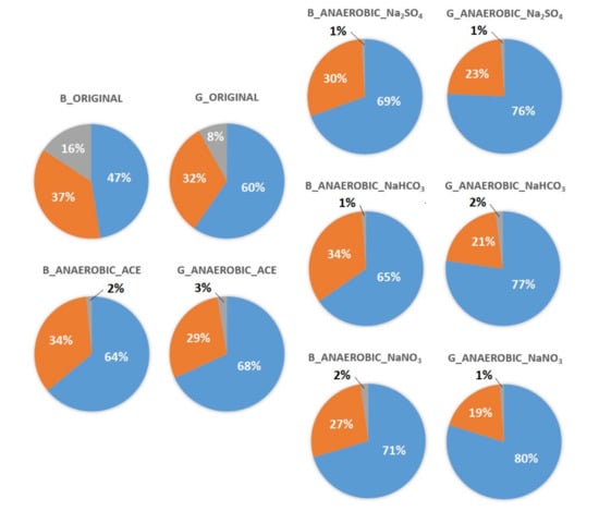 The effects of the addition of NaNO3, Na2SO4 or NaHCO3 are shown in Figure 7. Under anaerobic conditions and with the addition of the electron acceptors, a large increase in the proportion of detected bacteria in the Guandu and Bali sediments (from 60% to 80% and from 47% to 71%, respectively) was observed, with a simultaneous reduction in the proportion of archaea (from 32% to 19% and from 37% to 27%, respectively).