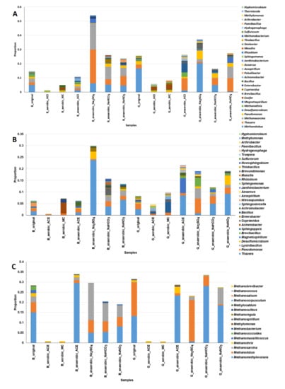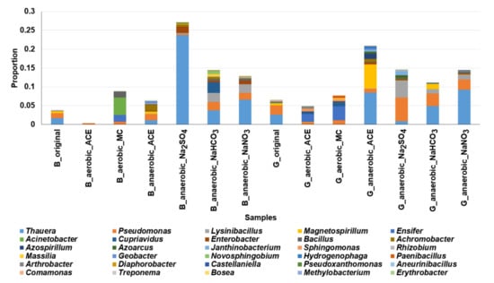The microbial communities associated with the sediments supplemented with NaNO3, Na2SO4 or NaHCO3 are shown in Figure 8. For the Bali sediments, the overall proportions of nitrogen metabolism bacteria (Figure 8A), sulfate–sulfur metabolism bacteria (Figure 8B) and methanogens (Figure 8C) observed under anaerobic conditions were greater than those detected under aerobic conditions (two proportion test, p < 0.05). Similar results were observed for the Guandu sediments.
