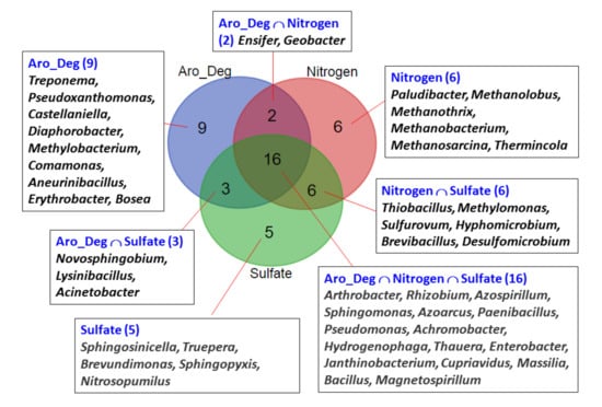 Identification of common and differential microbial genera detected between the different experiments by Venn diagram analysis. Aro_Deg: Major 30 microbial genera identified in the experiments using electron acceptors, which are associated with aromatic compound degradation. Nitrogen: Major 30 microbial genera identified in the experiments using electron acceptors that are associated with nitrogen metabolism. Sulfate: Major 30 microbial genera identified in the experiments using electron acceptors that are associated with sulfate–sulfur metabolism.