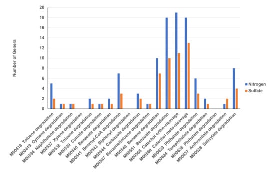 Distributions of number of major microbial genera with different aromatic compound degradation pathways. Mxxxxx are KEGG database module ID. Nitrogen: 30 major microbial genera identified in the experiments using electron acceptors that are associated with nitrogen metabolism. Sulfate: Major 30 microbial genera identified in the experiments using electron acceptors that are associated with sulfate–sulfur metabolism.