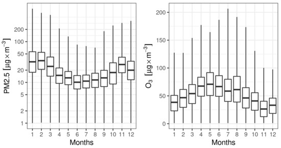 Hourly concentrations of PM2.5 and O3 observed in years 2017–2018 in Poland (please notice log y axis for PM2.5). Boxplot for each month summarizes all available measurements. Boxplots show: median, 25th and 75th percentile, minimum and maximum values.