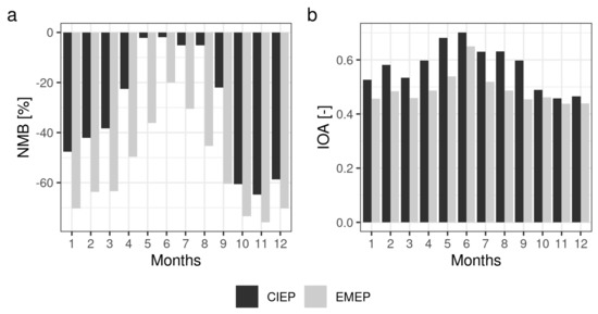 The WRF-Chem model performance for SIA is very similar for CIEP and EMEP (Figure 5). On average, the model represents well SO42− and NH4+ and significantly underestimates NO3−. For SO42− both simulations overestimate observed concentrations in winter (up to 40% in February) and underestimate them from March to November. Index of agreement is also similar for EMEP and CIEP, and is the highest (c.a. 0.6) for winter months. For the remaining months, IOA is close to 0.5 for both model runs. For NH4+, EMEP and CIEP show similar patterns, with maximum IOA in winter exceeding 0.7. NH4+ concentrations are underestimated for all months except December. NO3− is underestimated for all months both for EMEP and CIEP.