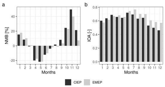 For O3 both CIEP and EMEP are above the observed values for January–February and September–December. NMB is close to zero for March and August. For the remaining months, O3 is underestimated. Both model runs show similar seasonal pattern for NMB.