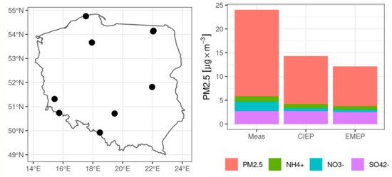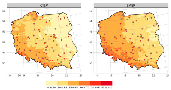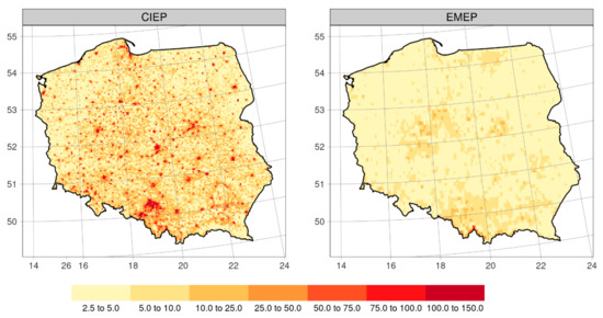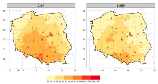 The spatial pattern of PM2.5 is presented using February 2018 mean values as an example (the highest PM2.5 and PM10 were observed in February) in Figure 9. Concentrations calculated with CIEP run are significantly higher than EMEP. In addition, CIEP emission data are capable of reproducing small towns, with relatively high emission of primary particulates. These locations are missing if the EMEP emission inventory is used, as more local emission is averaged out in a large grid cell. However, the general spatial pattern in monthly concentration is similar. The highest concentrations are calculated over the southern areas of the country, including Upper Silesia and Kraków. Grid-to-grid correlation is close to 0.90 and the mean difference is close to 3.1 μg m−3. A similar spatial pattern in monthly concentration and agreement between the CIEP and EMEP run is observed for PM10.