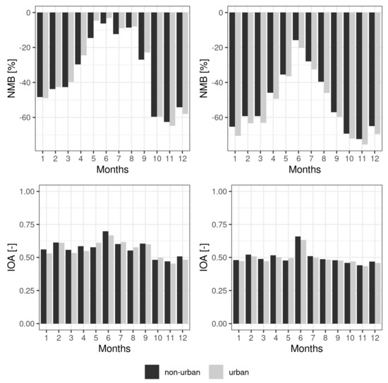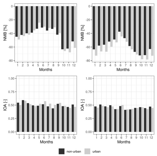 We used Normalized Mean Bias (NMB, eq. 1) and Index of Agreement (IOA, eq. 2) to summarize the model errors (O is for observations, M for models and N for number of pairs model-observations). More information on these statistics is provided by [39] and [40]. The statistics were calculated according to months as a mean from all stations for the period of 2017-2018 and according to type of stations.