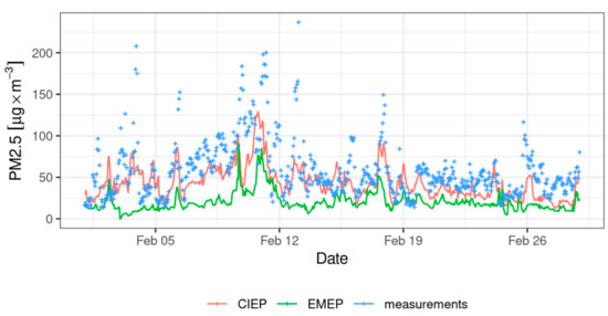 February 2018 hourly PM2.5 concentrations are also presented in detail for Katowice station (18.97E, 50.27N; Figure 10). The station is located in the center of the highly polluted area of Upper Silesia. The station is strongly affected by the emission from residential coal combustion. The model–measurement agreement is significantly improved for the CIEP run. Still, the peaks are underestimated, but this shows the role of the residential combustion for PM2.5 concentrations. Similar patterns are observed for PM10 and other stations affected by residential heating emissions in Poland.