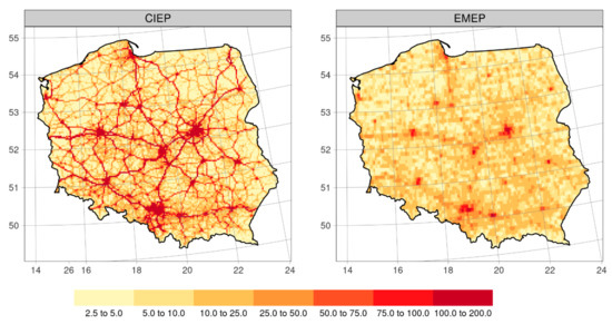 A similar approach was earlier applied by [33], but the TNO MACC III (Monitoring Atmospheric Composition and Climate-III) emission database [34] was used as an input to the EMEP4PL model, with source spatial resolution of 1/8° × 1/16o. The change in emission between the EMEP and CIEP runs are significant, and are summarized for NMVOC, NO2, PM10 and PM2.5 in Table 1. Generally, the CIEP emissions are higher for PM2.5 and PM10, both for residential combustion (70% and 43%, respectively for PM2.5 and PM10) and road transport (83% and 72%, respectively). For NOx, CIEP SNAP sector 2 is 23% lower if compared to the coarse resolution EMEP. NOx emission from road transport is 56% higher for CIEP if compared to the EMEP inventory. For NMVOC, CIEP emissions are 43% higher for SNAP 2 and 31% lower for SNAP 7 if compared to EMEP.