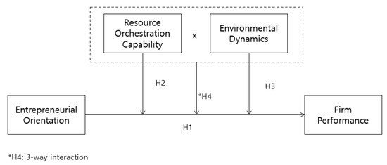 On the other hand, firms with low environmental dynamics and low resource orchestration capabilities anticipate fewer benefits from or are less attracted to new technologies or actively developing markets. Moreover, this attractiveness is further reduced due to low resource orchestration capabilities. Therefore, such firms are expected to promote a stable and efficient operation process and focus more on strategies to increase their share in the existing market as opposed to taking risks, proactively developing markets, or pursuing innovation activities [4,18]. That is, under the condition of low environmental dynamics and low resource orchestration capabilities, the process through which EO influences firm performance may be further weakened. Therefore, we established the following hypothesis pertaining to a three-way interaction effect that encompasses a firm’s internal competence (resource orchestration capability), external environment (environmental dynamics), and EO for a more detailed explanation that considers the dynamic interaction between external environmental conditions and a firm’s internal competence. This study’s conceptual model is illustrated in Figure 1, and we posited the following hypothesis.