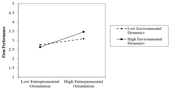 However, the effect of EO on performance will increase in the case of high environmental dynamics. This may be due to two reasons: First, because higher environmental dynamics generate more market development opportunities and escalates the advantages of being the first mover in the market, the positive impact of EO on firm performance is bolstered [34,35]. Second, in markets with high environmental dynamics, firms profit from being the first mover on a technology or market even before acquiring a complete understanding of the necessary behaviors or performance, and thus, firms frequently seize the opportunity through risk-taking behaviors—an important characteristic of EO [36]. Therefore, we can assume that in markets with high environmental dynamics, firms with higher EO would have a higher potential in gaining a competitive advantage by capturing various market opportunities and developing new technology, thereby improving firm performance. Hence, we hypothesized the following.