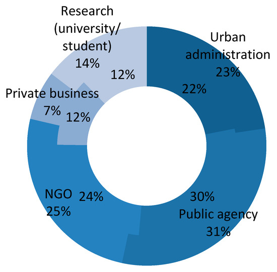 The PC2050 scenarios were developed in a series of three workshops held in each city with local stakeholders. These involved the creation of a post-carbon 2050 vision, a back-casting exercise, and the development of strategies, actions and milestones [39]. The average composition of local stakeholder groups in the first two workshops is shown in Figure 1. From these visions and actions, a qualitative description of the cities was also developed as a background for interpretation in the quantitative modelling.