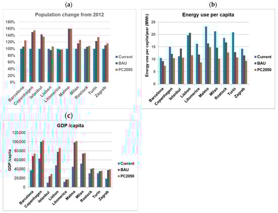 Scenario modelling results of the main elements for the ten case study cities for current (2012), BAU 2050 and PC2050. (a) Population change (%) from 2012. (b) Energy use per capita. (c) GDP per capita. Source: adapted from [9].