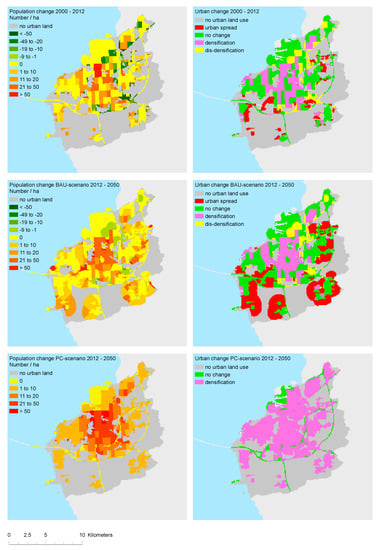 To model the population distribution of the BAU and PC2050 scenarios we matched and extrapolated the modelled 2050 population (Section 2.2) with the 2012 population distribution derived from Landscan. For the BAU scenario, we assumed that up until 2050 the same relationship between land-use change and population change observed from 2000 to 2012 will be followed. A similar method was used to model the areas of reduced population density. To localize types of urban change, we applied the automated cellular model [55].