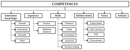 Competences mean knowledge, thanks to which one can pass judgments, make decisions, and voice authoritative opinions. A competent man is a man, who is adequately prepared for specific actions and who is also authorized to undertake them [16]. By analyzing a historical evolution of this issue, one must first refer to F. Taylor [3], who linked the skills of workers with their work stations and paid attention to a scientific selection of employees to workplaces and the development of their professional qualifications. At first, these issues were used with reference to the scope of duties, authorizations, or responsibilities for actions. It also referred to the behavior of employees, especially the effective behavior, which is not based only on measurement of single features [17]. An interesting approach can also be observed in the works by R. Boyatzis [18], who—when describing the competences—was the first one who started to distinguish traits that differentiate good employees from average or poor ones. This concept was developed by G. Cheetham and G. Chivers [19] in the form of professional competences, that comprise of: meta-competences (communication, self-development, creativity, problem solving) and core competences (cognitive, functional, behavioral and ethical). At the end of 20th century, C. Woodruffe [20] defined competences as a set of behavioral patterns needed for the proper implementation of tasks or functions. Whereas D. D. Thierry, Ch. Saureta, N. Monode [21] noticed that competences are general knowledge, skills, experience, attitude, and readiness of an employee to act in given circumstances.