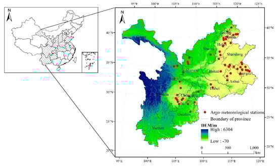 Wheat, one of the major food crops in China, is planted in most regions of the country [25]. The country could be divided into three production areas of wheat: the spring wheat region, the northern winter wheat region, and the southern winter wheat region. The cultivation areas of wheat are mainly distributed in northern China, the northern region of Northeast China and the north-eastern area of Southwest China [26]. According to the Chinese National Bureau of Statistics, the planting area of wheat in China in 2018 was 24.51 million hectares, of which winter wheat accounted for 93% [27]. This study was performed in the main planting area of winter wheat in China (Figure 1). This region has an area of 2.86 million km2 and is located at 92°44′~122°41′ E and 21°07′~42°48′ N. It is mainly located in temperate and subtropical monsoon climate zones of China, characterized by a synchronization of high temperature and ample precipitation. The average annual temperature and precipitation are approximately 10.4 °C and 800 mm, respectively.
