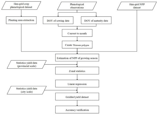The flowchart of this study is shown in Figure 2. First, the planting areas were extracted based on a 1 km-grid crop phenological dataset along with the months of sowing and maturity that were determined using phenological observations. Second, the cumulative NPP during the growing season of winter wheat was calculated based on the planting area, the months of sowing and maturity, and the 1 km-grid NPP dataset. Third, the yield spatialization model was established using the NPP of the growing season, along with the yield gridded dataset generated from 2000 to 2015. Finally, the accuracy of the yield gridded dataset was verified.