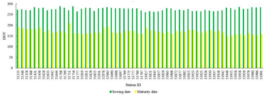 The months of sowing and maturity were determined using phenological observations from Argo-meteorological stations from 1994 to 2013. First, the DOYs of sowing and maturity stages in each station were extracted every year. This was followed by calculating the annual averages of sowing and maturity stages that are shown in Figure 3. Third, the DOYs of sowing and maturity were converted to months. Finally, the Thiessen polygon method was used to obtain the spatial distribution of the sowing and maturity months.