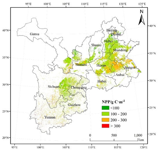 The spatial distribution characteristics of the NPP during the growing season of winter wheat from 2000 to 2015 were demonstrated by calculating the annual averages of NPP (Figure 4). The results showed significant differences in NPP for different regions. The NPP during the growing season of winter wheat from 2000 to 2015 was concentrated between 0.06 and 640 gC·m−2, with an average of 165.39 gC·m−2. The high NPP was mainly concentrated in the North China Plain, especially in southwestern Shandong, southeastern Henan, northern Anhui, and northern Jiangsu, where the NPP was more than 200 gC·m−2. Additionally, the distribution of areas with high NPP (more than 200 gC·m−2) was relatively scattered over some areas, such as Yunnan, Guizhou and Sichuan. The low NPP was mainly distributed in eastern Gansu, central Shanxi, southern Hebei, and eastern Sichuan, where the NPP was below 100 gC·m−2. Consequently, the NPP during the growing season could reflect the spatial heterogeneity of winter wheat.