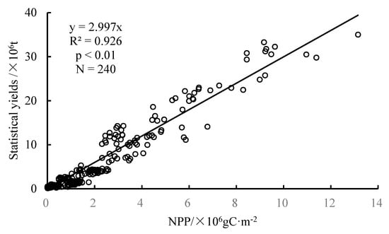 where Yi is the statistical yield in the ith province, (NPPG)i,j is the jth pixel of NPPG in the ith province, is the yield distribution coefficient, and b is a constant. According to the principle of “no land, no yield”, b equals to 0.