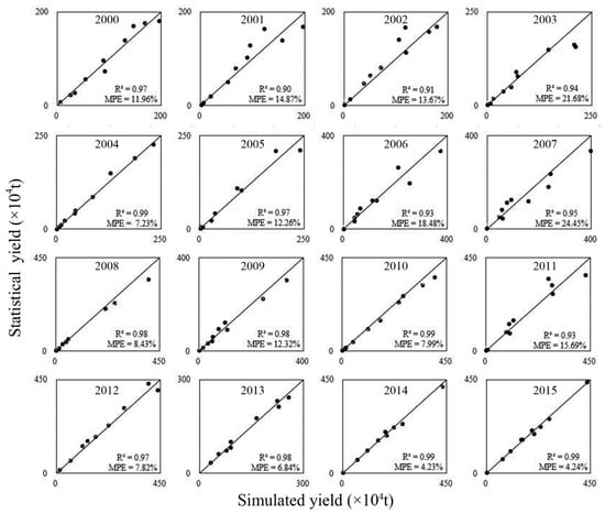 Due to data availability, it is difficult to obtain verification data at the pixel scale. In this study, statistical yield at the city scale were collected. To verify the accuracy of the gridded yield dataset, a total of 160 cities (10 cities per year) were randomly selected as samples. Total production of each city was calculated based on the gridded yield dataset. Figure 6 shows comparisons between the gridded yield dataset and statistical yields at the city scale from 2000 to 2015.