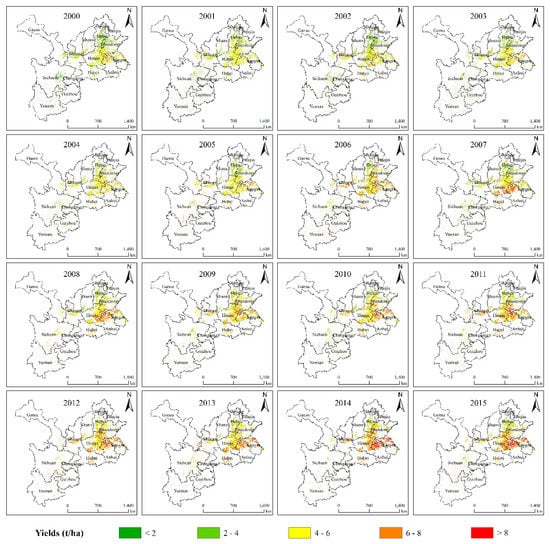 Figure 7 shows the spatial distribution of winter wheat yields from 2000 to 2015. The results showed that the distribution of yields has apparent spatial differences. The yield had a pattern that indicated a high yield in the east and a low yield in the west. Similar to NPP, the high yield was mainly concentrated in the North China Plain, especially in southwestern Shandong, southeastern Henan, northern Anhui, and northern Jiangsu, where the yield was more than 6 t/ha. This region is the main winter wheat production area of China. Abundant light, heat, and water resources are the favorable factors for crop production [33,34]. The low yield was mainly distributed in eastern Gansu, central Shanxi, southern Hebei, and eastern Sichuan, where the yield was below 4 t/ha. Complicated topography and light deficiency are the major factors restricting yields from increasing in these regions.