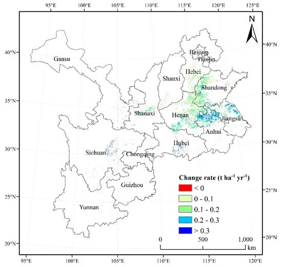 The spatial distribution of the annual change rate of winter yields from 2000 to 2015 is shown in Figure 8. Notably, areas that passed the significance test (p < 0.05) participated in the analysis. The trends mainly showed an increase of an average rate of 0.17 t ha−1 yr−1 from 2000 to 2015 in the study area. There was also significant spatial heterogeneity in the trends of winter wheat yield in different regions. The region that increased was mainly concentrated in the North China Plain, while the distribution of the region that decreased was relatively dispersed. The difference in the North China Plain between the north and the south is apparent. Additionally, the increase rate is larger in the south (mainly > 0.2 t ha−1 yr−1) than that in the north (mainly < 0.2 t ha−1 yr−1). The yield benefited from many factors, such as climate warming, cultivars shift, and fertilization [33,35,36].