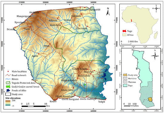 The study was carried out in the Togodo Protected Area (TPA) and its surroundings (Figure 1) in southeastern Togo (West Africa). Agriculture is the main activity in the area. The climate is of the equatorial transition type, with rainfall of 1000 to 1300 mm per year and average monthly temperatures ranging from 25 °C to 29 °C. The study site is dominated by Guinean wet savannahs with some patches of semi-deciduous dry and dense forests [21].